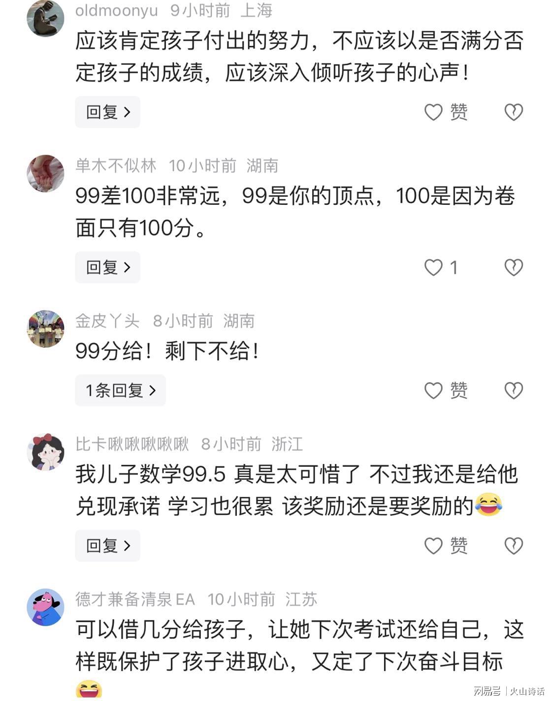 针对此事,有网友评论,应该肯定孩子付出的努力,不应该以是否满分否定孩子的成绩,应该深入倾听孩子的心声!