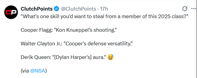 雷速体育7月6日讯 ClutchPoints今日发表推文,在被询问2025届同级新秀中,你最希望偷走谁的哪项技能时。库珀·弗拉格说,是康·克内普尔的投篮;小沃尔特·克雷顿说,是弗拉格均衡的防守能力;德里克·奎因则表示,是迪伦·哈珀的气场。